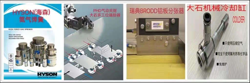 本公司是HYSON氮氣彈簧在中國的總代理,并提供管路設計及售后服務。同時還代理美國PHD氣動夾鉗、SWEDEN機器人平衡缸、美國LSP噴涂系統(tǒng)、法國PRONIC模內攻絲機等。另外,本公司還提供多工位模具自動化端拾器產(chǎn)品,從設計、制造、運輸、安裝、調試為客戶提供整套“交鑰匙”工程。